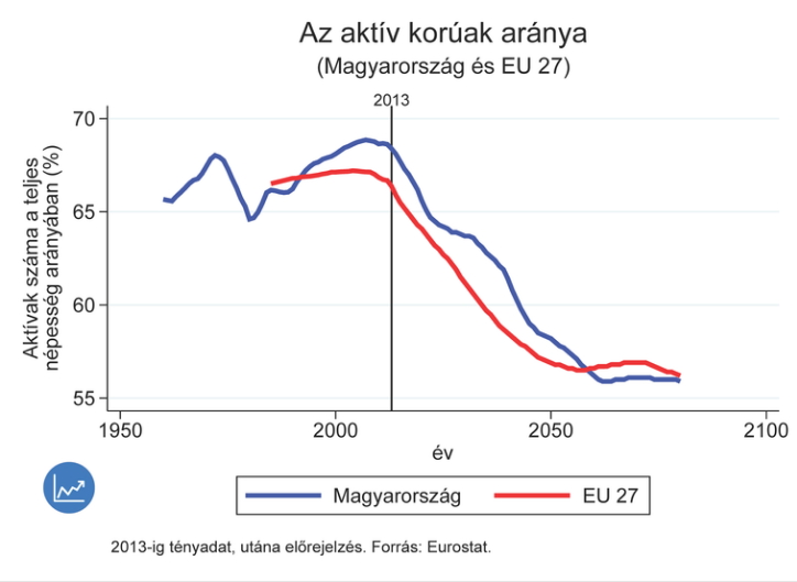 | A kisebb létszámú utód generációk kevesebbet fogyasztanak, csökken az állam bevétele, miközben nő a fogyasztó idős réteg és a vele szociális kiadások. | Jelentős, radikális beavatkozásokkal a folyamat irányának a megváltoztatása. | HISZÜK program | |
